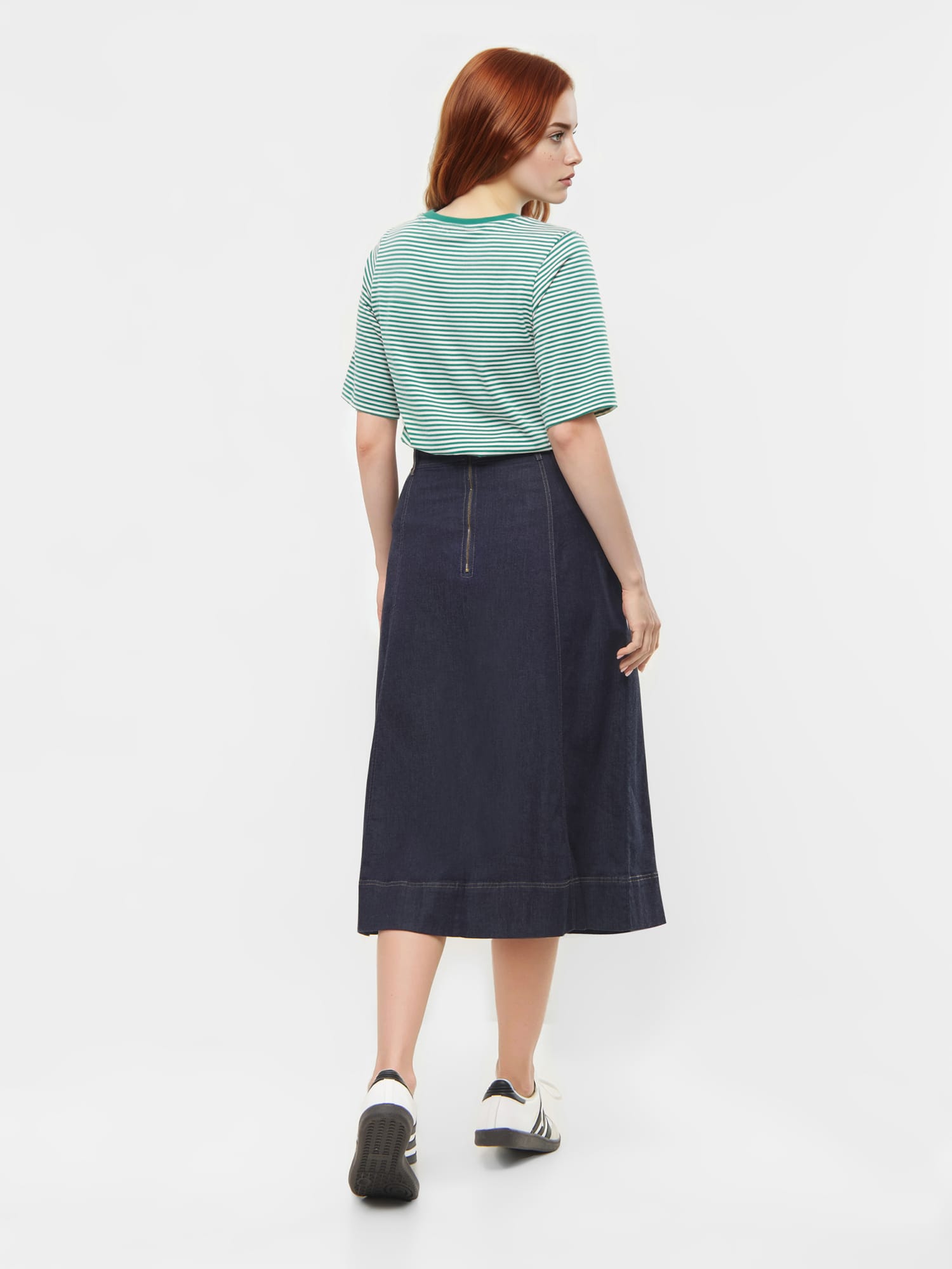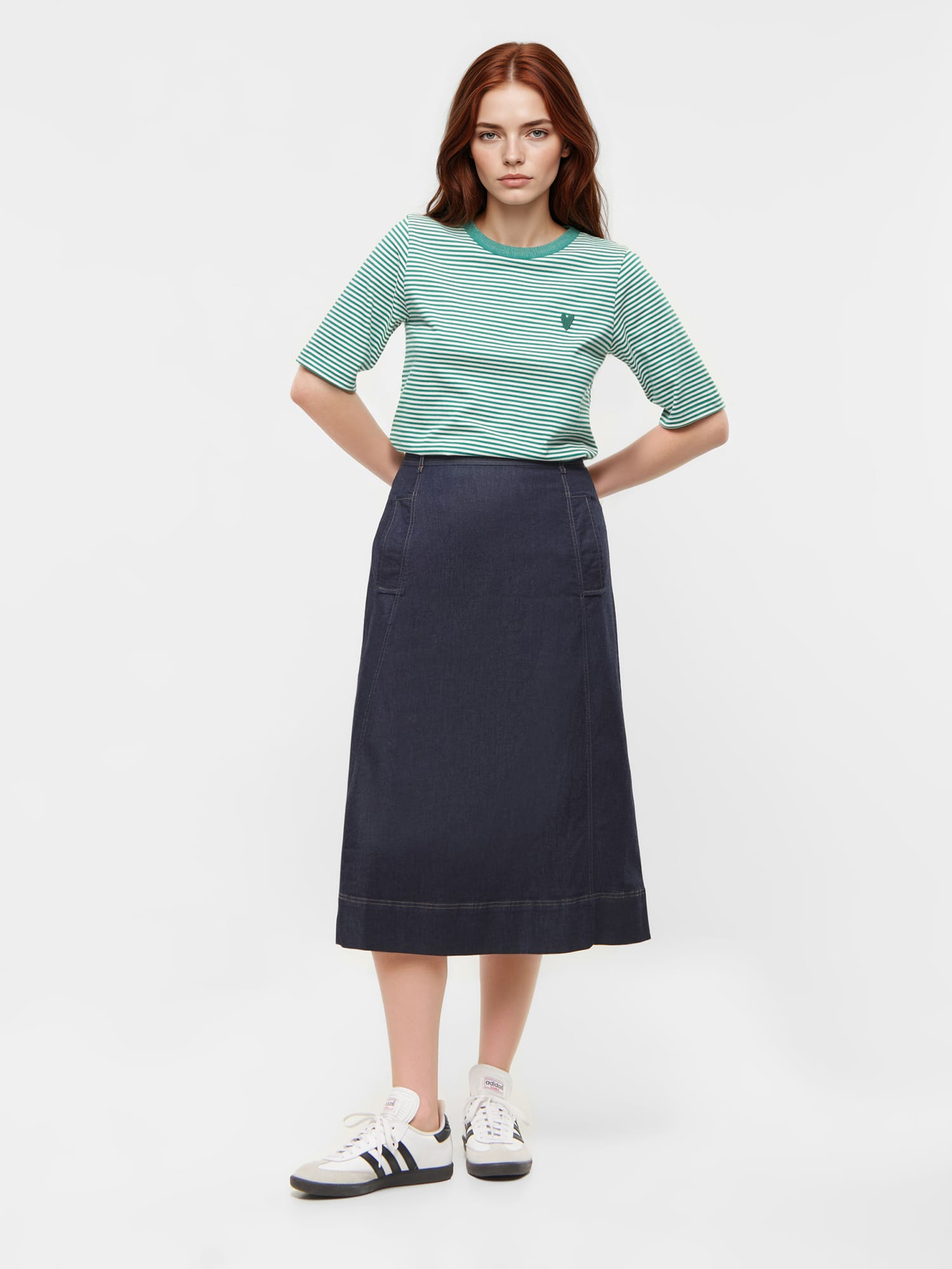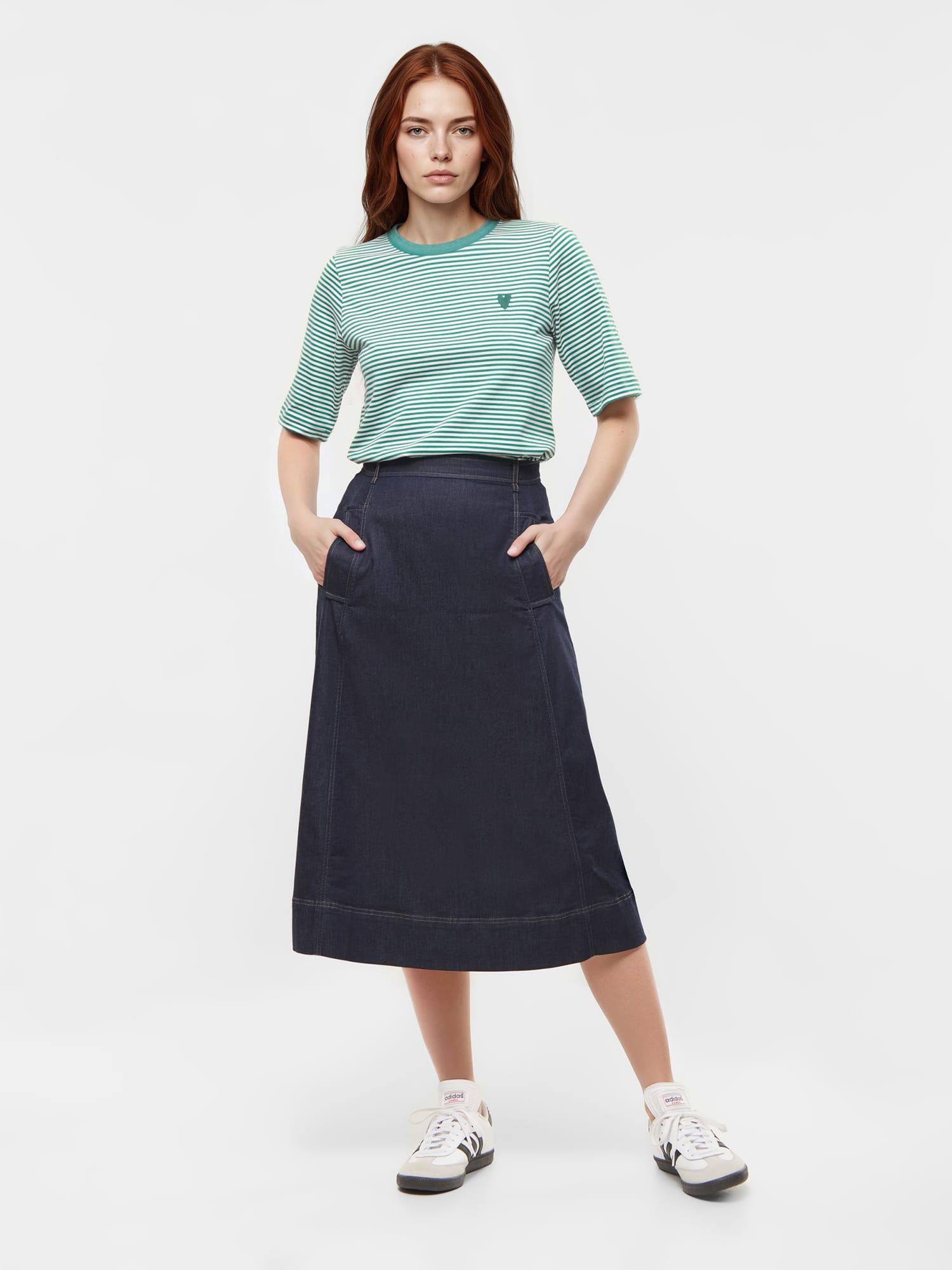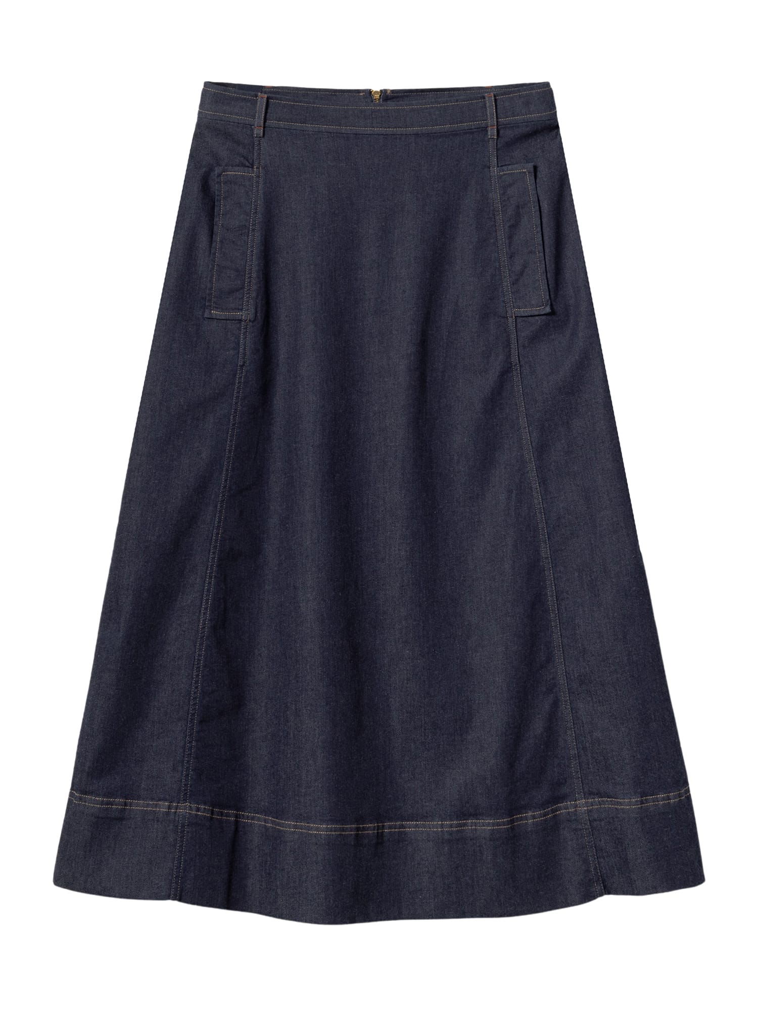 Ausgestellt und lässig: Dieser Jeansrock mit Trench-Taschen passt perfekt zur Strumpfhose und zu Stiefeln.
