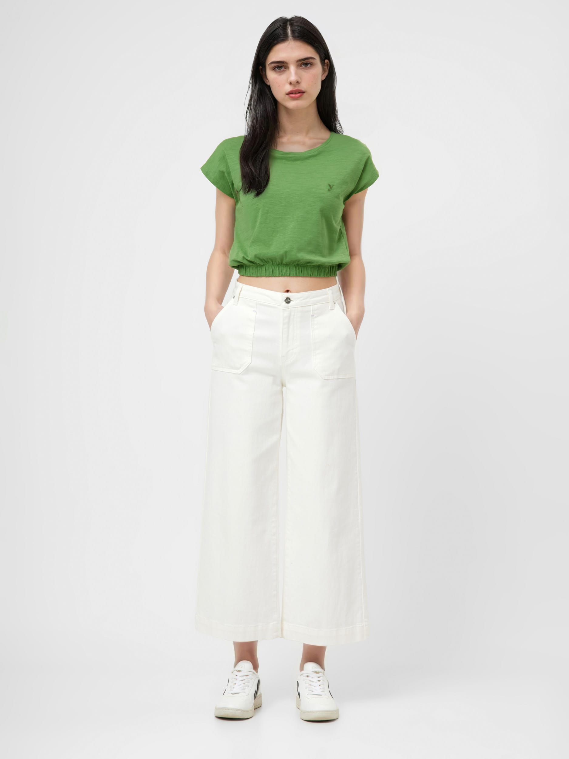 Lässig und stylish: Unser Crop-Top in sommerlichem grün mit kleinem Bruststick. Toll zur High Waist Jeans.-100% Baumwolle (Bio)